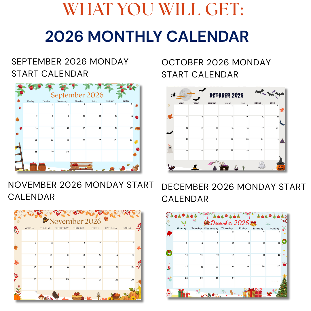 • 12 Page Artistic Monthly Monday Start - January 2026 till December 2026 calendar