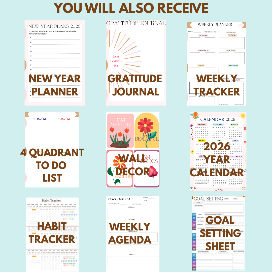 Get our 12 monthly calendar for 2026 to achieve your Goals in the new year!